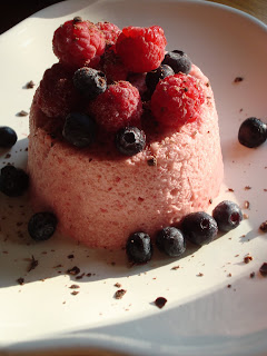 After all the rich festive food we've been eating I fancied something lighter, more delicate - something with a little burst of summer. So I made these raspberry mousses topped with wild raspberries and bilberries I picked last summer.